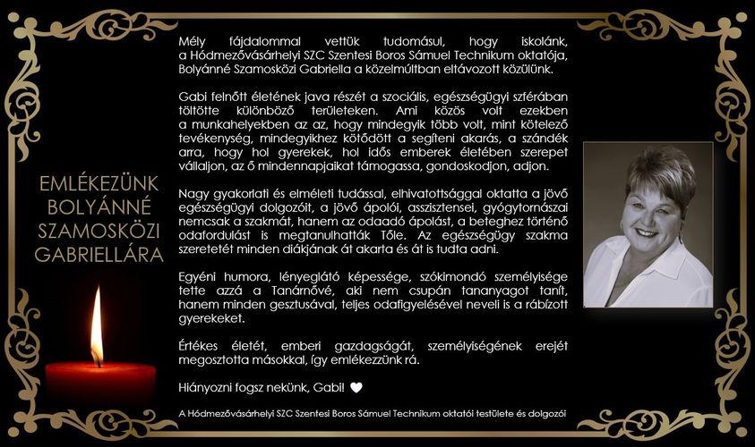 Mély fájdalommal vettük tudomásul, hogy iskolánk, a Hódmezővásárhelyi SZC Szentesi Boros Sámuel Technikum oktatója, Bolyánné Szamosközi Gabriella a közelmúltban eltávozott közülünk.