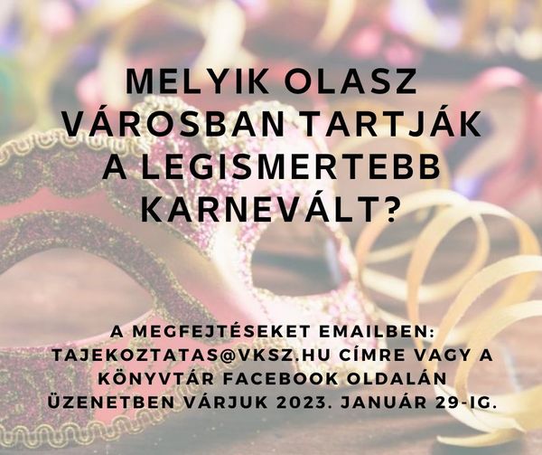 Új rejtvényeink a farsangi ünnepkörhöz kapcsolódnak! A helyes megfejtéseket 2023. január 29-ig várjuk email-ben a tajekoztatas@vksz.hu címre, vagy itt a facebook oldalon ÜZENET-ben.