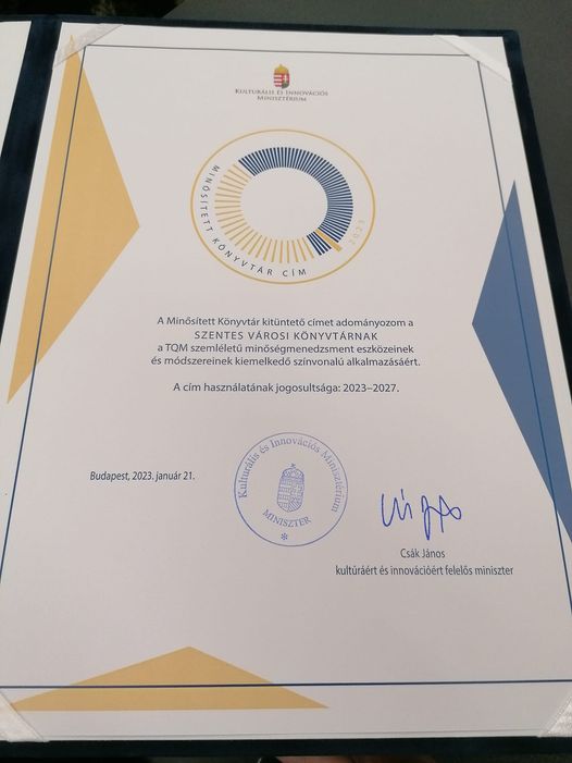 Megkaptuk a Minősített Könyvtár címet másodszorra is. A Magyar Kultura Napja alkalmából át is vehettük fizikai valójában is.