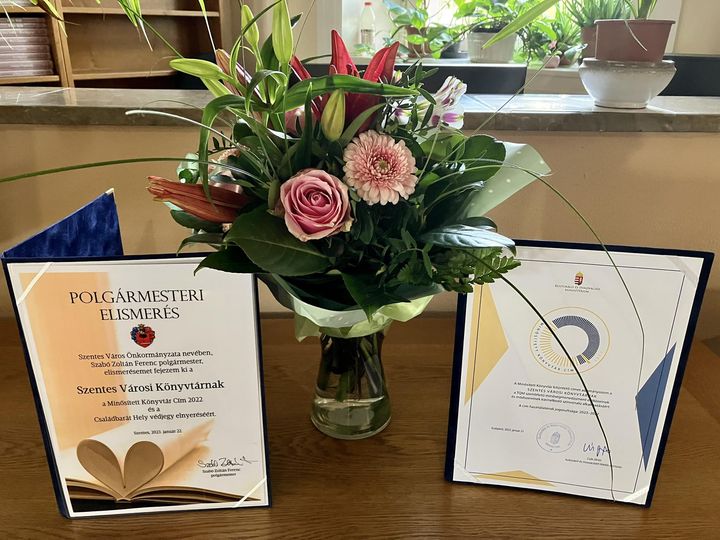 A kultúráért felelős miniszter könyvtárunk magas színvonalú szakmai munkáját ismét – Minősített Könyvtár címmel ismerte el, melyet 2023. január 21-én vehettünk át személyesen. Ehhez a címhez városunk polgármestere Szabó Zoltán úr is elismerését fejezte ki.