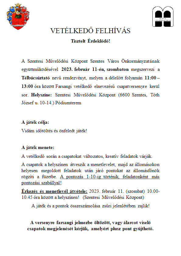 2023. február 11-én a Szentesi Művelődési Központ a Télbúcsúztató keretein belül egy vetélkedőre hívja az érdeklődőket, melyre kicsiket és nagyokat egyaránt várunk!