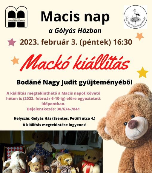 2023. február 3-án (pénteken) 16:30 órától Mackó kiállítás nyílik a Gólyás Házban Bodáné Nagy Judit gyűjteményéből!
