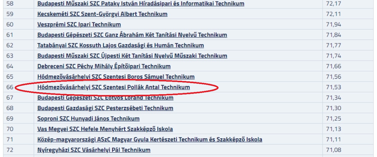 A HSZC Szentesi Pollák Antal Technikum a 66. helyen bekerült a technikumok országos, a 100 legjobb intézményt rangsoroló listájára! Az összeállítás a Nemzeti Szakképzési és Felnőttképzési Hivatal adatai alapján, a tanulók bemeneti és képzési-kimeneti teljesítményének, az intézmények oktatói létszámának és digitális ellátottságának figyelembevételével készült. Az elemzés vizsgálta, hogy a tanulók milyen tanulmányi eredménnyel érkeznek az intézményekbe, hogyan aránylik az évismétlők száma az intézmény tanulói létszámához, és milyen eredménnyel teszik le az érettségi vizsgát.
