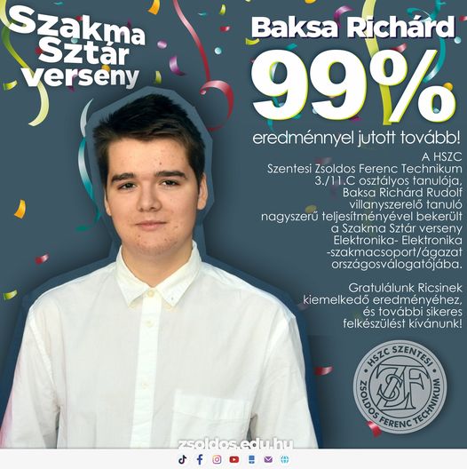 A HSZC Szentesi Zsoldos Ferenc Technikum 3./11.C osztályos tanulója, Baksa Richárd Rudolf villanyszerelő tanuló nagyszerű teljesítményével bekerült a Szakma Sztár verseny Elektronika- Elektronika -szakmacsoport/ágazat országos válogatójába.