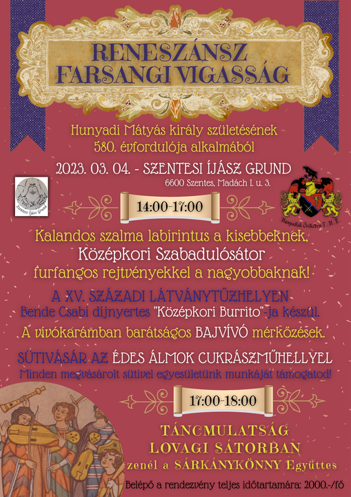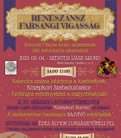 2023. március 4-én Hunyadi Mátyás király születésének 580. évfordulója alkalmából Reneszánsz Farsangi Vigasságot rendeznek az Íjász Grundon. További részletek a plakáton!