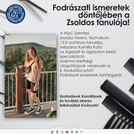 A HSzC Szentesi Zsoldos Ferenc Technikum 12.K osztályos tanulója, Mészáros Kamilla Kata az Ágazati és ágazaton belüli specializáció szakmai érettségi vizsgatárgyak versenyén a II. fordulóba jutott Fodrászati ismeretek tantárgyból.