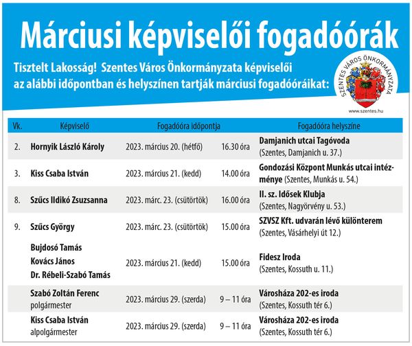 Kérdése, kérése van a körzetét vagy a várost érintő ügyekben? Keresse képviselőjét az alábbi helyszíneken és időpontokban!