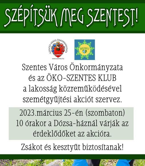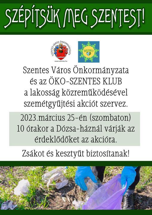 Szentes Város Önkormányzata és az ÖKO-SZENTES KLUB a lakosság közreműködésével szemétgyűjtési akciót szervez.