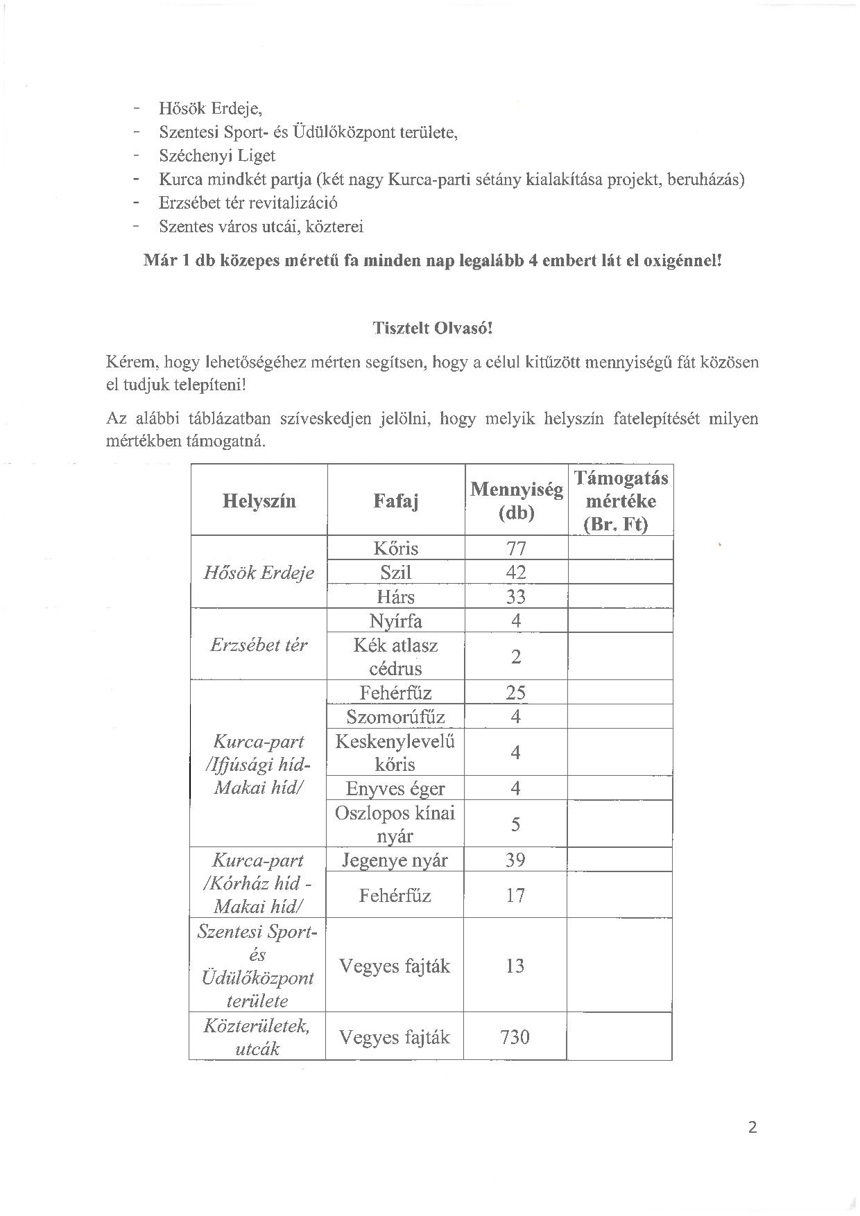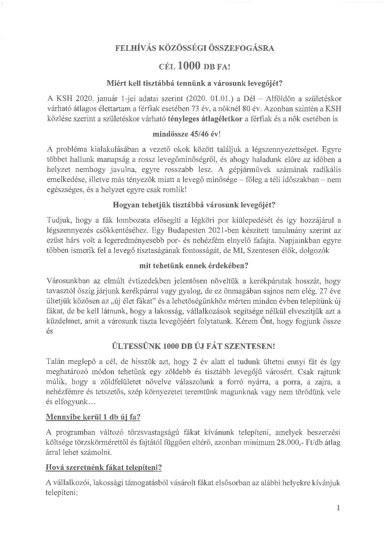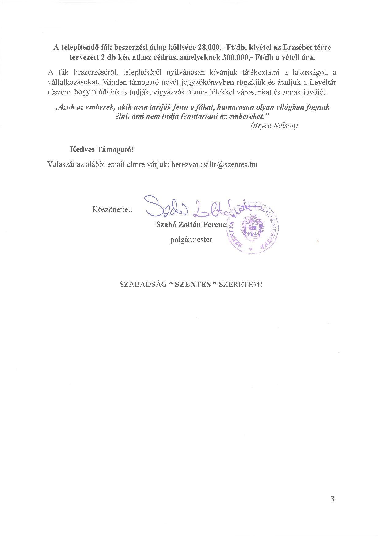 Hogyan tehetjük tisztábbá városunk levegőjét? Ültessünk közösen 1000 darab fát Szentesen! Szabó Zoltán Ferenc polgármester felhívása közösségi összefogásra. Kérjük, aki teheti, támogatásával járuljon hozzá a program sikerességéhez! Információt kérhetnek Berezvai Csilla főkertésztől, a berezvai.csilla@szentes.hu e-mail címen.