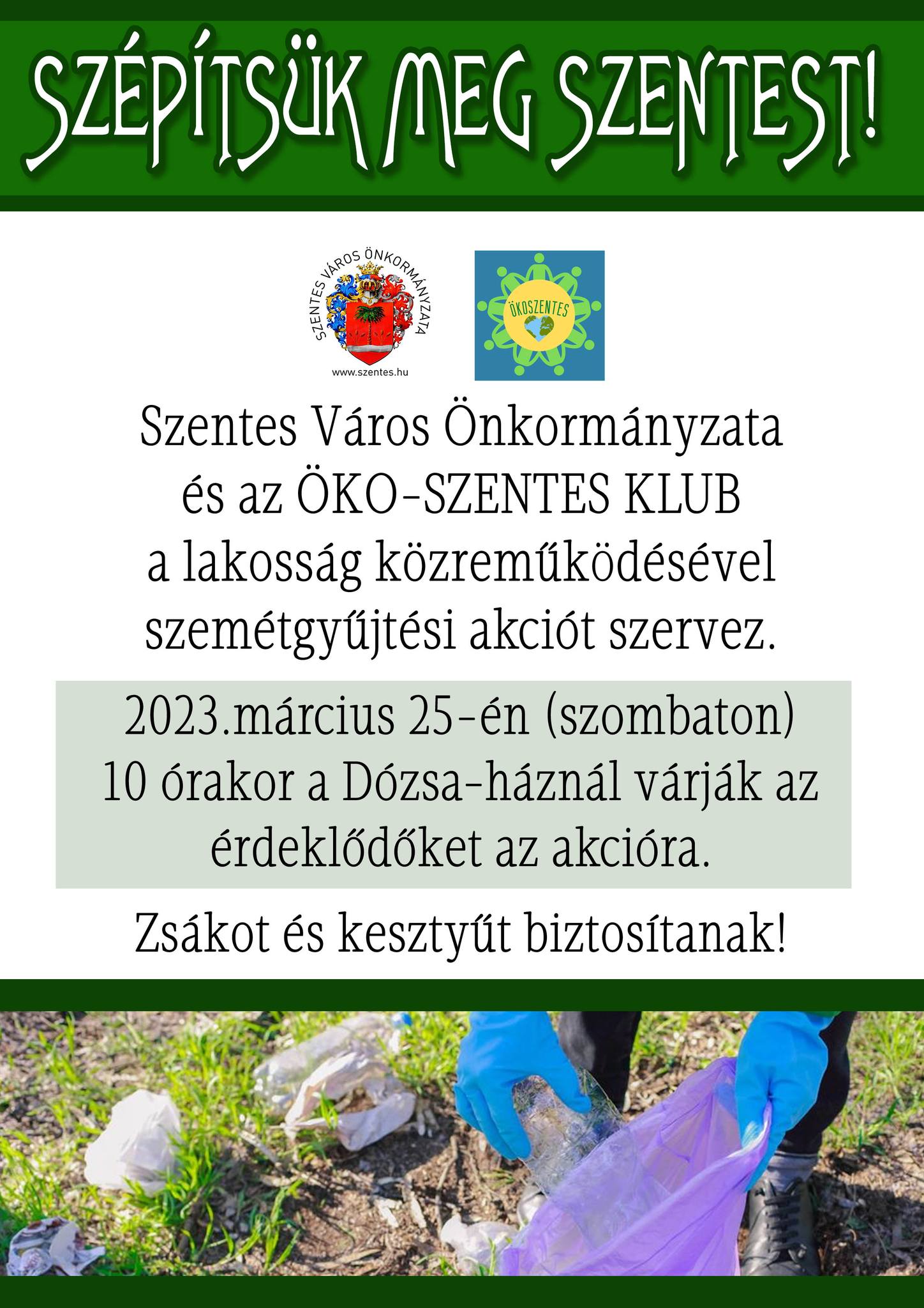 Szentes Város Önkormányzata és az ÖKO-SZENTES KLUB a lakosság közreműködésével szemétgyűjtési akciót szervez ezen a hétvégén. A felhívásnak eleget tévő intézmények a mai napon