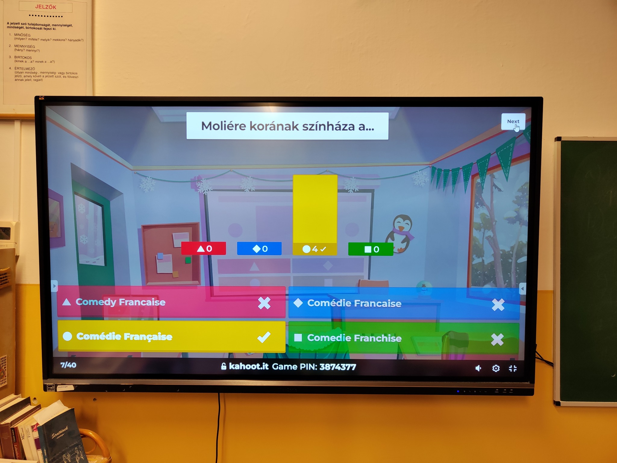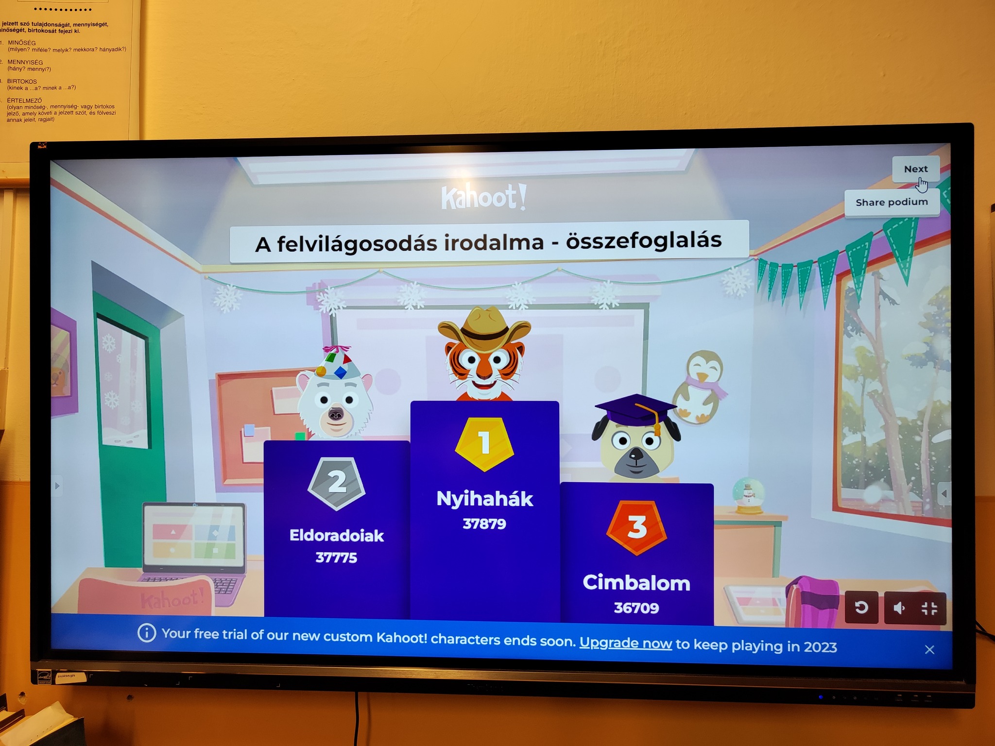 Ezen a héten is, mint mindig, sokféle alkalmazást és eszközt használtunk a közismereti órákon is: Geogebra, Learningapps, Quizlet, Wordwall, Okostankönyv, interaktív tábla, mobiltelefon… A mellékelt fotókon éppen egy februári igen jól sikerült online vetélkedő emlékeit láthatjuk: a felvilágosodás irodalmát foglalták össze a diákok a Kahoot applikáció segítségével. A tét igen nagy volt, hiszen az első fotón szereplő győztes csapatnak nem kellett megírnia a témazárót. 🙃