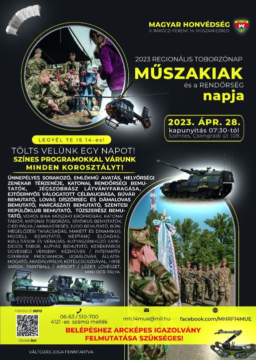 a Műszakiak Napja regionális toborzónapot, amely egyben nyílt laktanyanap is, illetve közösen szervezik a Rendőrség Napjával. FONTOS! A RENDEZVÉNYRE ARCKÉPES IGAZOLVÁNY FELMUTATÁSÁVAL LEHET BELÉPNI!