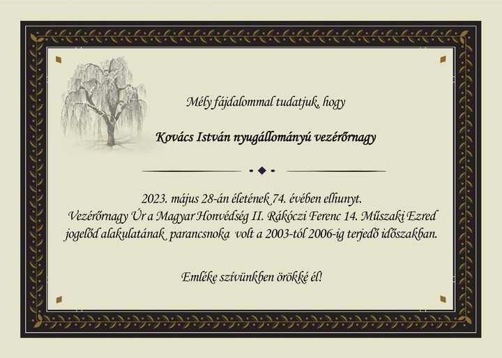 2023. május 28-án életének 74. évében elhunyt Kovács István vezérőrnagy a Magyar Honvédség II. Rákóczi Ferenc 14. Műszaki Ezred jogelőd alakulatának volt parancsnoka (2003-2006).