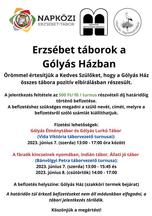 A befizetés helyszíne: Gólyás Ház (szakköri termek bejárat)