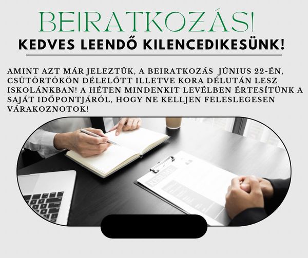 Iskolánkban a beiratkozás – a korábbi értesítésnek megfelelően – 2023. június 22-én, csütörtökön lesz. A pontos beosztást, az egyéb tudnivalókat levélben küldjük mindenkinek ezen a héten!
