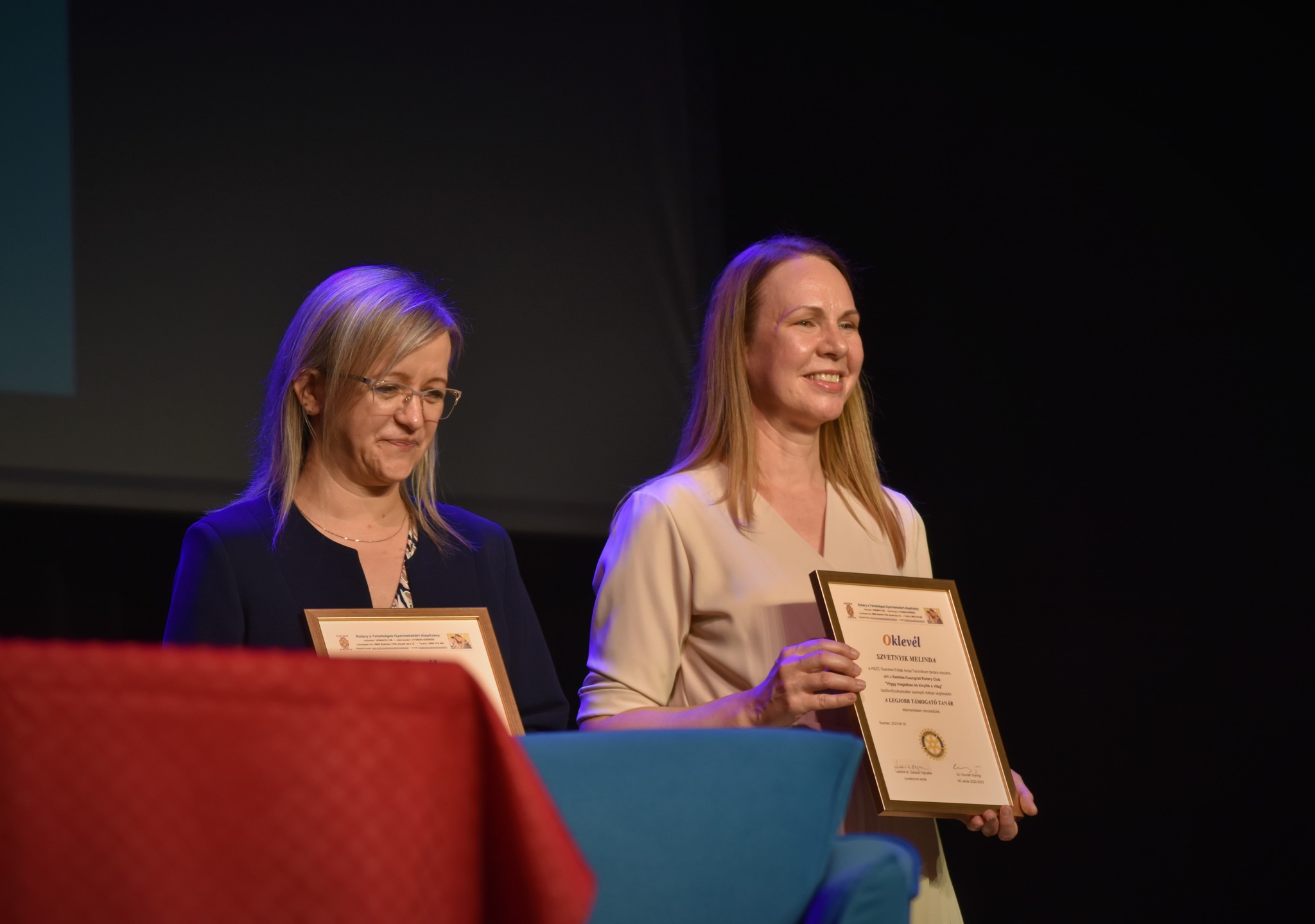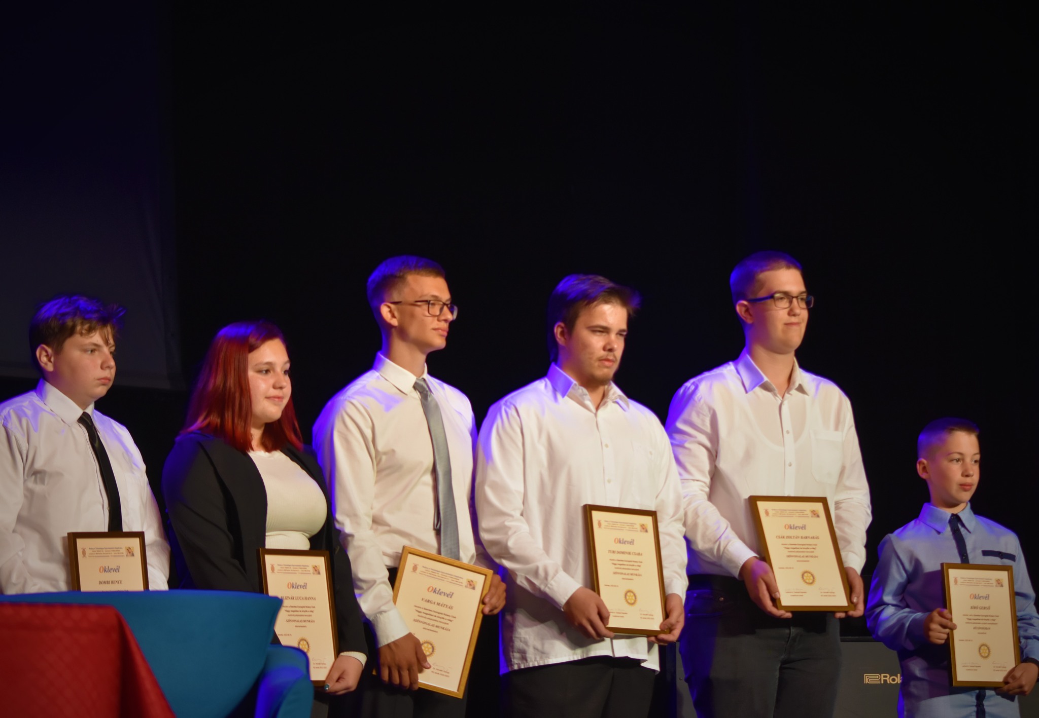 A Szentes-Csongrád Rotary Club június 16-án rendezte meg „Higgy magadban és kinyílik a világ!” című ösztöndíj-pályázatának díjkiosztó gálaműsorát a Tóth József Színházban. Szerencsére iskolánk diákjai és oktatói ezen az ünnepélyes alkalmon is meghívottként szerepeltek, és szép sikereket értek el. A következő 10.B osztályos tanulók vehettek át elismerést és pénzjutalmat: Csák Barnabás – elismerő oklevél, Pálinkás Róbert és Varga Máté – bronz minősítés, Köllő Balázs – ezüst minősítés. Osztályfőnökük, Szvetnyik Melinda a „Legjobb támogató tanár” elismerésben részesült. Mindenkinek szívből gratulálunk, és azt kívánjuk, hogy minél hamarabb valóra válthassák a pályázatban leírt terveiket! A fotókat köszönjük Csák Zoltánnak, egyik díjazottunk édesapjának!