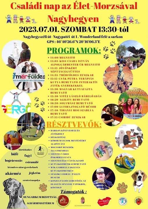 Családi nap az Élet-Morzsával címmel szervezi meg immár negyedik alkalommal kutyás programjait az egyesület július 1-jén, szombaton, délután fél 2-től. A magyar kutyafajta, terápiás kutyákkal interaktív játék, agility és solymászbemutatón túl a 7mérföldes és a Csiribú zenekarok is szórakoztatják a közönséget Nagyhegyen. Céljuk a felelős kutyatartásra való nevelés, és egyesületük munkájának, elhivatottságának bemutatása, megismertetése. Ajánlónkat a Szentesi Élet 6. oldalán találják.