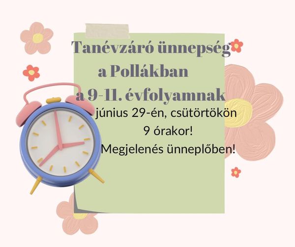 Évzáró ünnepség: bizonyítványosztás, elismerő oklevelek és jutalmak átadása június 29-én, csütörtökön 9 órakor. Gyülekező: az iskola udvarán. Várjuk minden 9-10-11. évfolyamos diákunkat szeretettel! 🔔🎓🎈