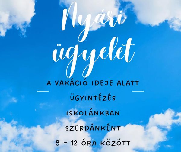 Iskolánk a nyári szünet ideje alatt szerdai napokon (július 5., 12., 19., 26., augusztus 2., 9., 16.) 9 és 12 óra között tart ügyeletet. Ekkor van lehetőség iskolalátogatási igazolás kiállítására, bizonyítványok átadására, egyéb adminisztratív ügyek intézésére.