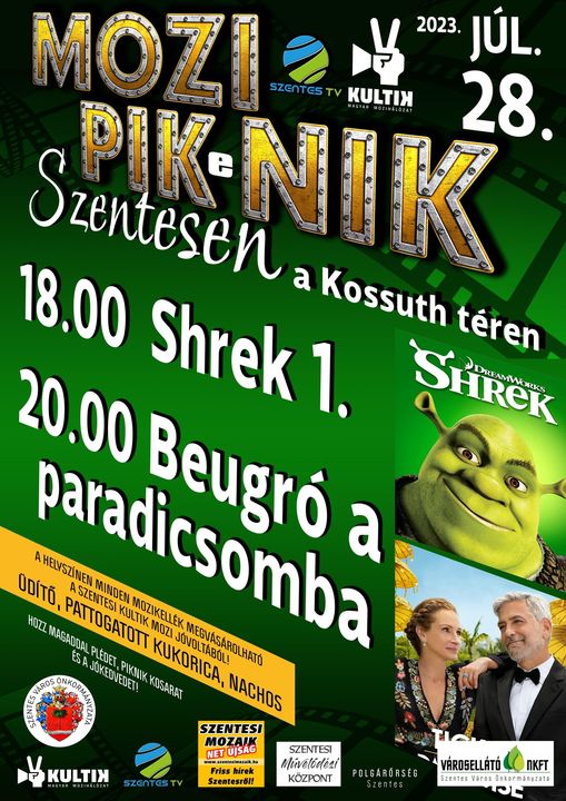 2023. július 28-án újra várja a filmrajongókat és piknikezőket a Mozi PIKeNIK a Kossuth téren. 18 órától láthatjuk ahogy egy legenda megszületik (Shrek 1.) valamint 20 órától a Beugró a paradicsomba című filmet.