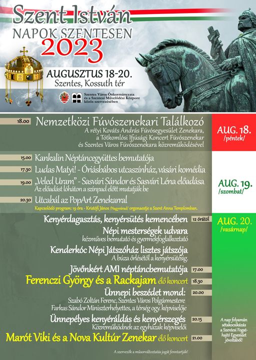 20-án 12 órától kezdődnek a programok, és 17.00 órakor a Jövőnkért AMI néptáncbemutatójával veszi kezdetét a színpadi műsor. Ferenczi György és a Rackajam elő koncertje után, kezdődik az ünnepi megemlékezés, kenyéráldás és kenyérszegés. Várhatóan 21 órától Marót Viki és a Nova Kultúr Zenekar ad élő koncertet Szentesen a Kossuth téren.