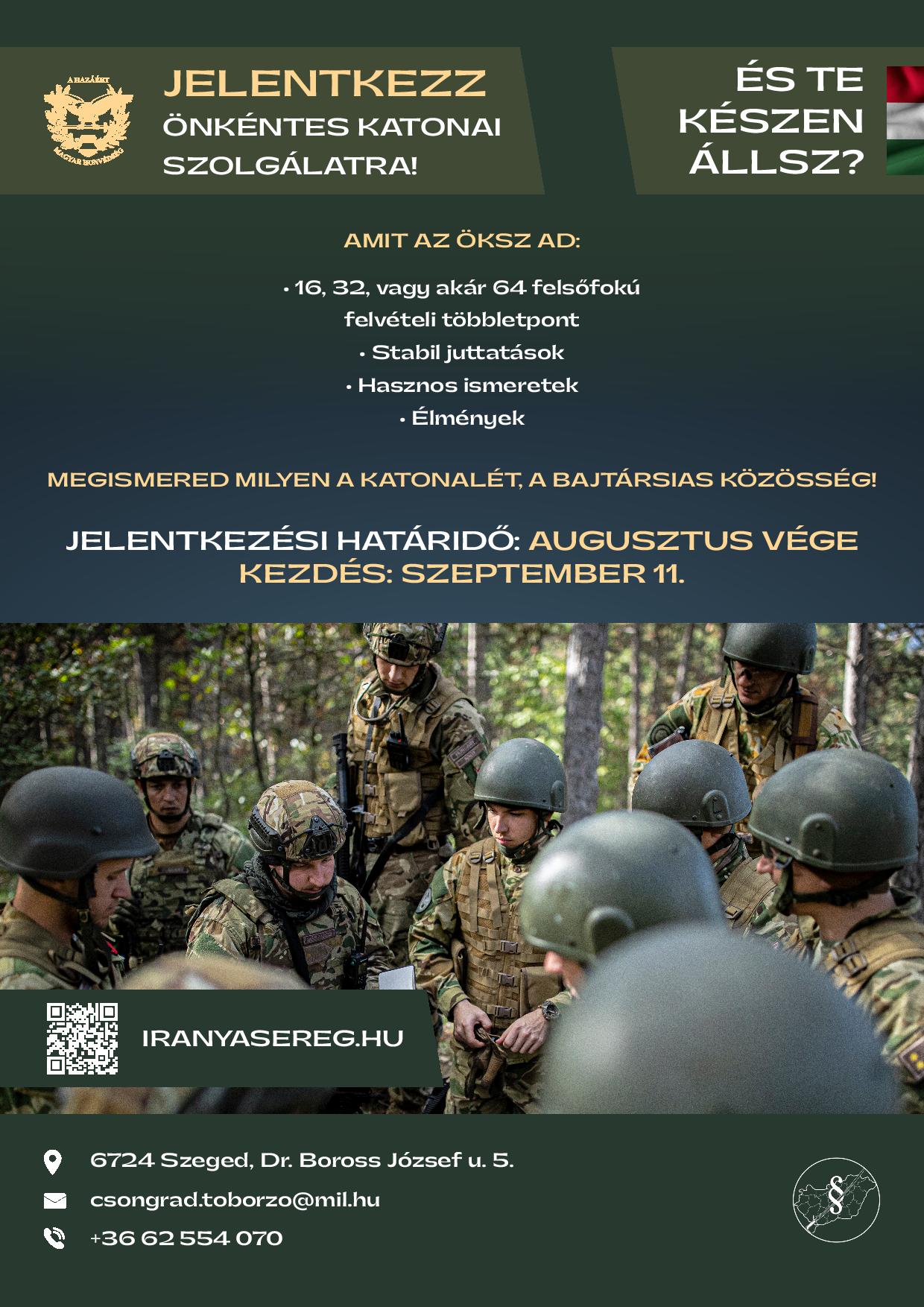 utazási költségtérítés, valamint szükség esetén szociális támogatás is jár a résztvevőknek. A képzés bármikor megszakítható, a hatodik hónap végén pedig még egyszer hat hónappal meghosszabbítható. A Katonai Igazgatási és Központi Nyilvántartó Parancsnokság 12. Hadkiegészítő és Toborzó Iroda (Szeged) munkatársai továbbra is várják (Szeged, Dr. Boross József utca 5.) a katonai szolgálat iránt érdeklődőket ügyfélszolgálatukon.