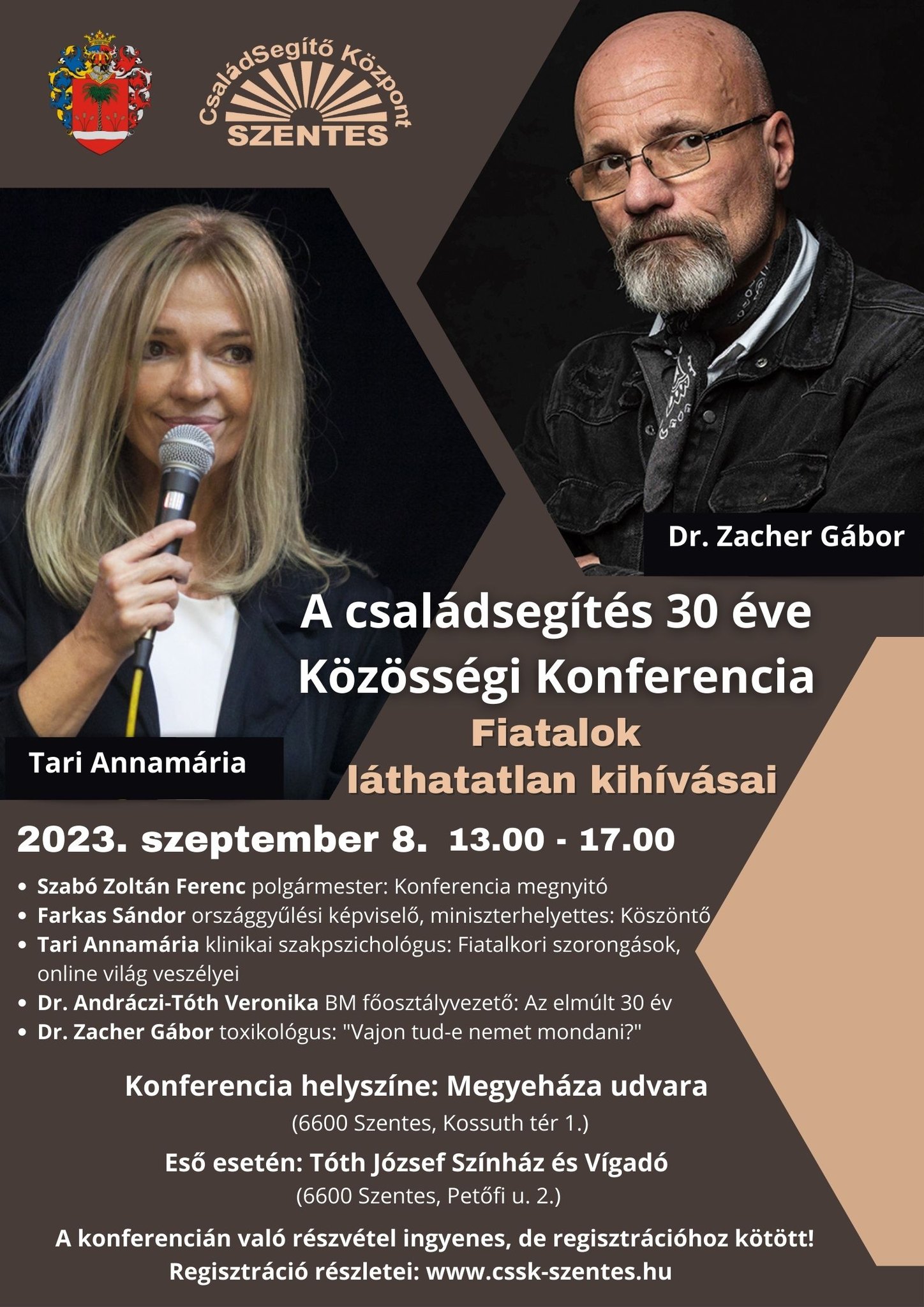 Ebből az alkalomból szerveznek konferenciát szeptember 8-án a Megyeháza udvarán. Az előadók között Tari Annamária és dr. Zacher Gábor is beszél a fiatalok kihívásairól. A