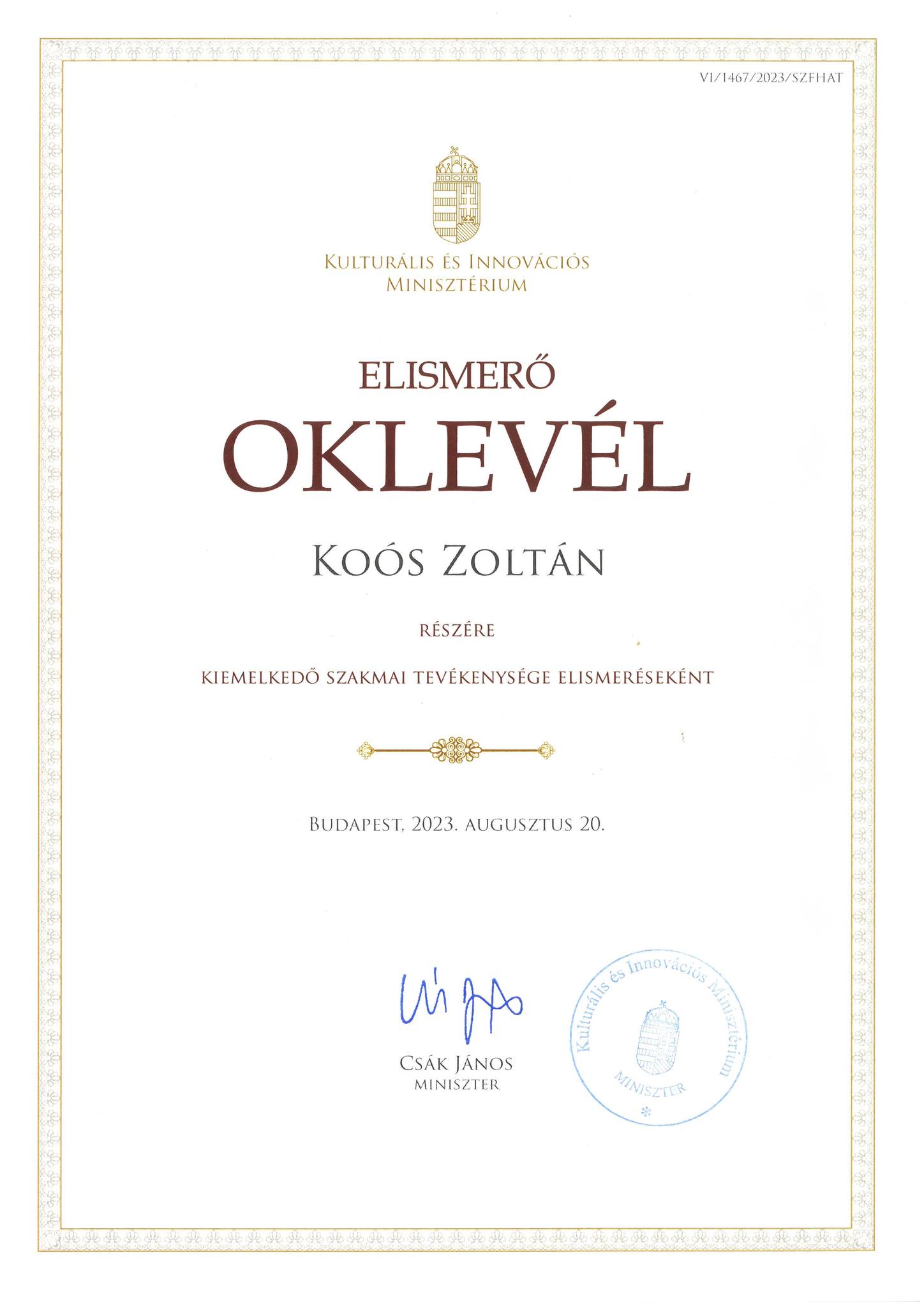 A tegnapi nap folyamán Koós Zoltán gyakorlati oktatásvezető a Kulturális és Innovációs Minisztérium által miniszteri elismerésben részesült Csák János Minisztertől.