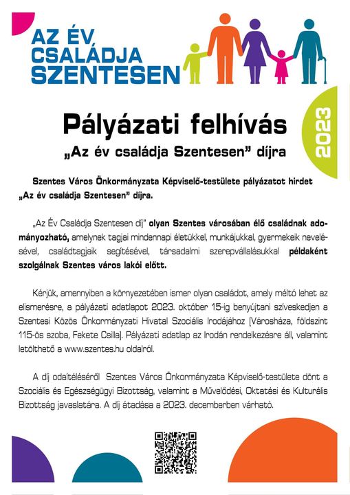 Kérjük, amennyiben a környezetében ismer olyan családot, amely méltó lehet az elismerésre, a pályázati adatlapot 2023. október 15-ig benyújtani szíveskedjen a Szentesi Közös Önkormányzati Hivatal Szociális Irodájához (Városháza, földszint