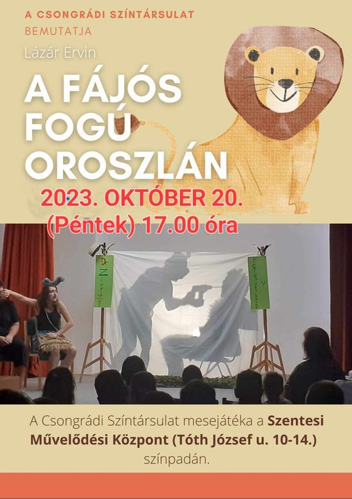 A Százszorszép óvoda alapítványa javára kerül bemutatásra Lázár Ervin: A fájós fogú oroszlán című mese az Ifjúsági ház nagytermében 2023. október 20-án 17 órakor. Jegyeket az óvodában, vagy a helyszínen lehet megvásárolni.