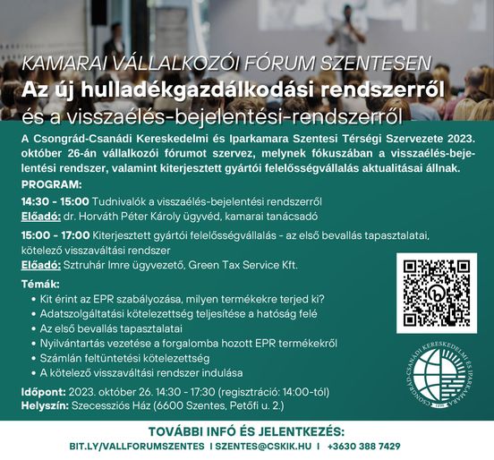 rendszer, valamint kiterjesztett gyártói felelősségvállalás aktualitásai állnak. Időpont: 2023. október 26. 14:30 – 17:30 (regisztráció: 14:00-tól)