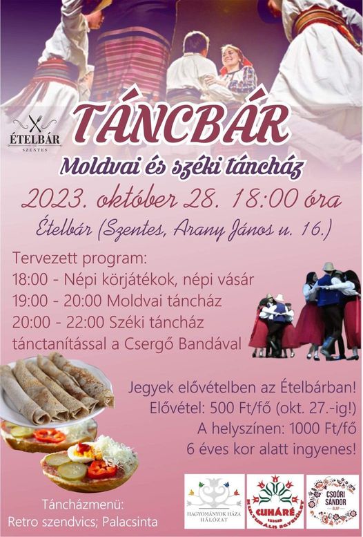 Szeretettel hívnak minden kedves szentesit és nem szentesit 2023. október 28-án, 18 órától, az Ételbárban megrendezésre kerülő Moldvai és széki táncházba!