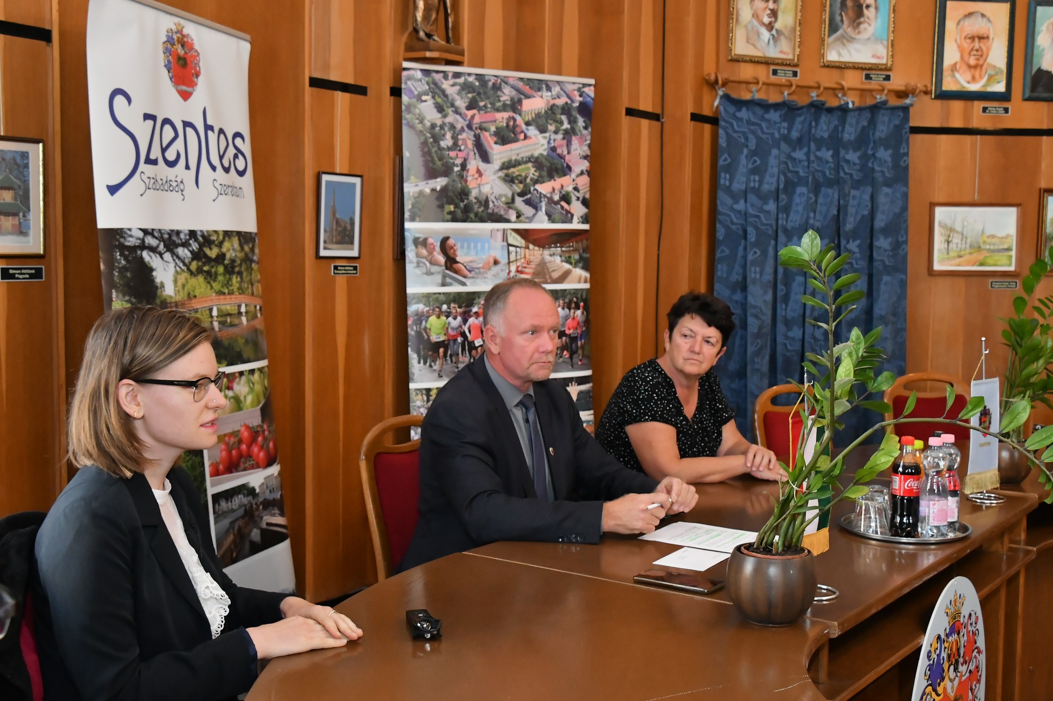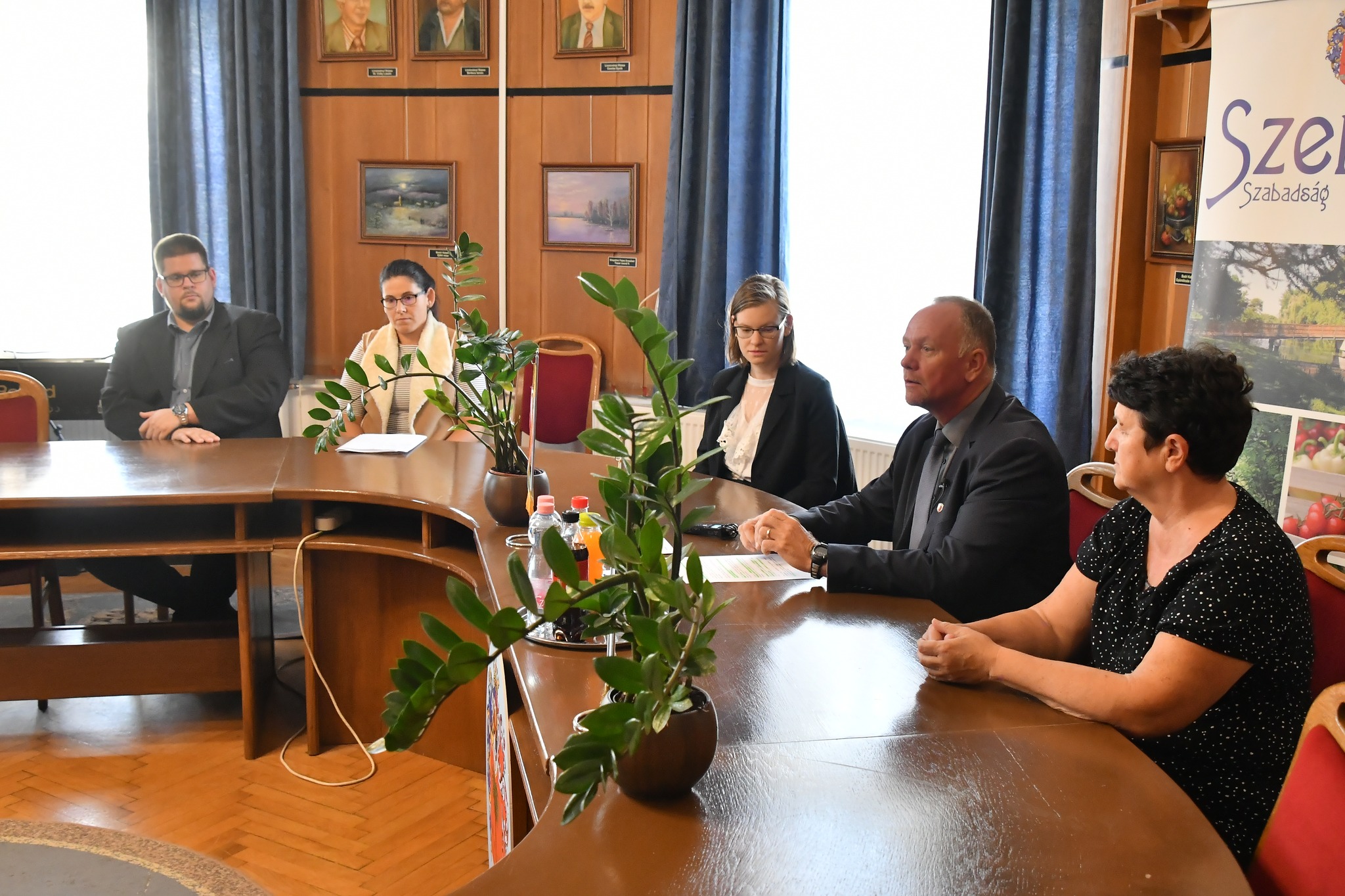 Nappali tagozatos, egyetemi vagy főiskolai hallgatókat támogat az önkormányzat ösztöndíjprogramja, amelyről Szabó Zolán Ferenc polgármester, Agócs Lászlóné önkormányzati képviselő, a Szociális és Egészségügyi Bizottság elnöke, Fekete Csilla a Szociális Iroda vezetője és Takács Ádám irodavezető-helyettes tartott tájékoztatást a hivatalban, 2023. október 24-én.