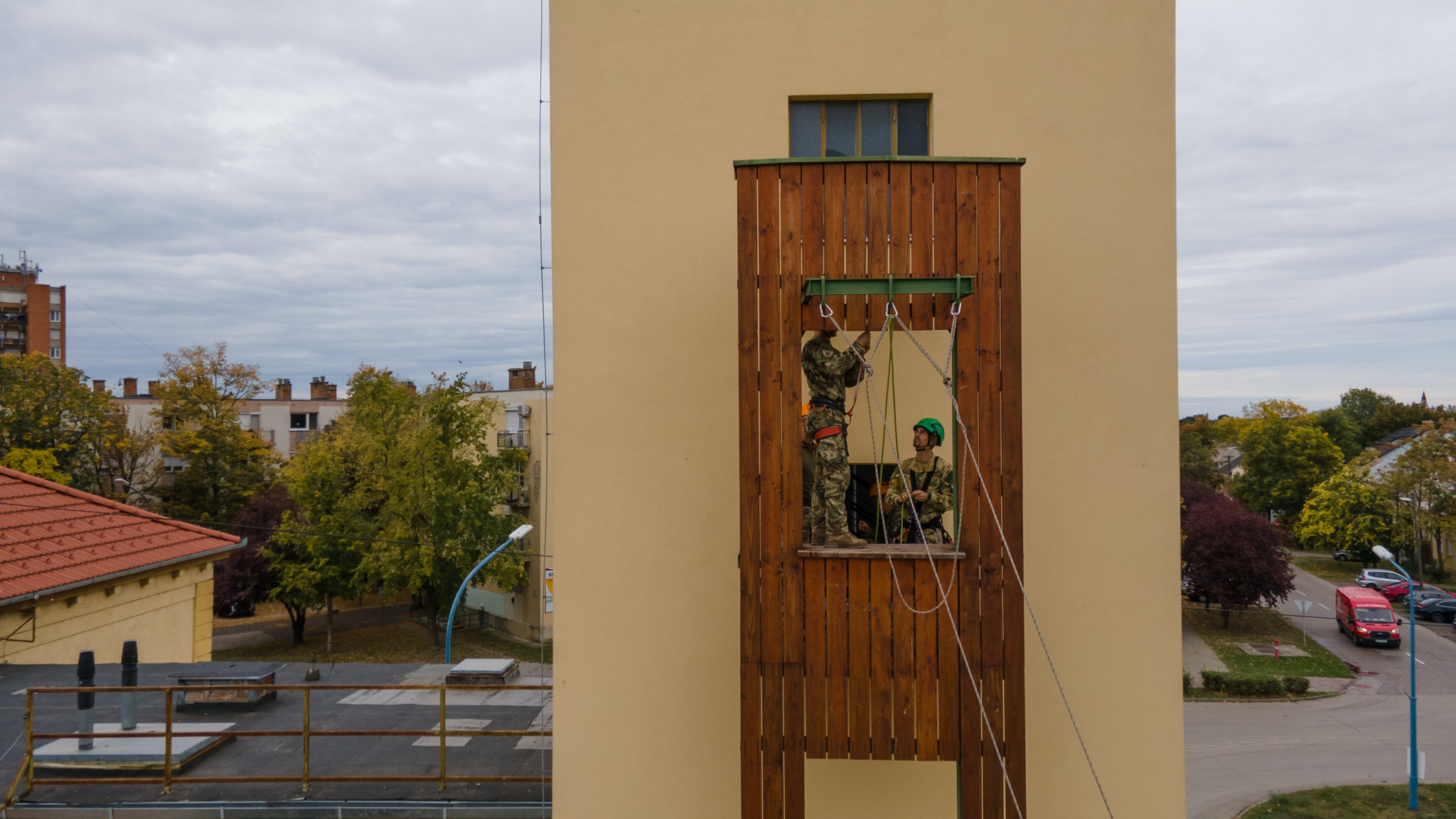 Az alpintechnikai feladatok végrehajtásához életszerű helyszínt biztosított a tűzoltó laktanya mászótornya, ahol a résztvevők gyakorlati foglalkozás keretében az ön- és társbiztosítás alapjait, tehermozgatást és a feszített kötélpályán történő leereszkedést sajátították el.