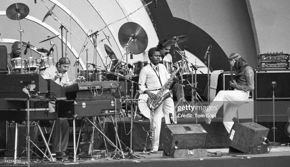 Weather Report’ (L-R Big Black, Joe Zawinul, Wayne Shorter, Peter Erskine and Jaco Pastorius) performs on stage at the Playboy Jazz Festival at the Hollywood Bowl in Los Angeles in June 1981.