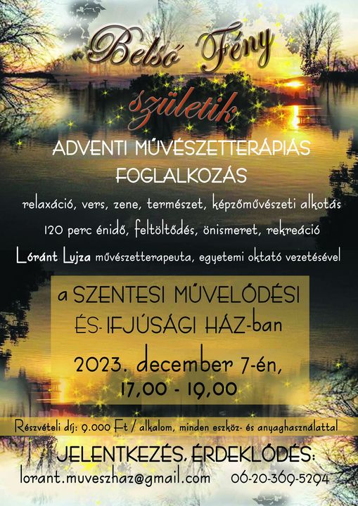 Advent ideje hívogat, hogy rendbe rakjuk az otthonunk, a gondolatainkat, a lelkünket. A természet pihen, nekünk is jó megpihenni, hogy megszülethessen bennünk a fény. Ki ne vágyna rá, hogy néha kizökkenjen a hétköznapok mókuskerekéből?! A Karácsonyt megelőző művészetterápiás foglalkozás a befelé figyeléshez nyújt segítséget, hogy meg tudd vizsgálni az életed, vajon úgy éled-e, ahogyan szíved-lelked szerint szeretnéd és milyen erőforrásaidat kell majd mozgósítanod az új évben céljaid eléréséhez, harmóniád megteremtéséhez.