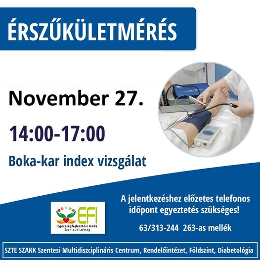 A Szentesi Egészségfejlesztési Iroda november 27-én hétfőn, 14-17 óráig érszűkületmérést szervez a szentesi és a járásban élő lakosok számára. A részleteket lapunk 13. oldalán olvashatják.