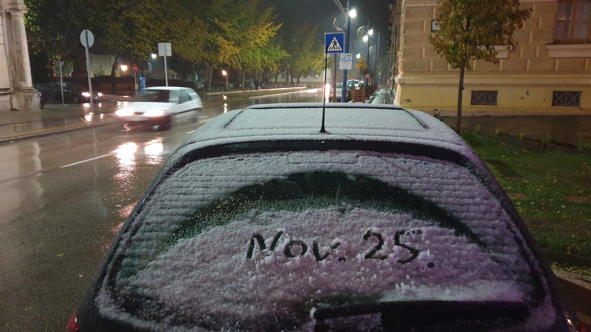 2023. november 25-én délelőtt még ragyogóan sütött a nap, majd észak felől szinte feketére változott az égbolt. Hófelhők jelentek meg és ennek köszönhető, hogy ezen a napon Szentesen leesett az első hó.