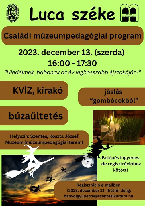 A 2023. december 13-ra hirdetett Luca napi program sajnos elmarad. Bízunk benne, hogy egy év múlva találkozunk! Megértésüket köszönjük! Luca széke