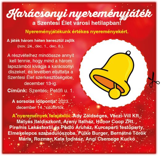 – dec. 8. ❄ 📮A részvételhez mindössze annyit kell tennie, hogy mind a három lapszámból kivágja a karácsonyi díszeket, és levélben eljuttatja a Szentesi Élet szerkesztőségébe, december 13-ig. Címünk: Szentes, Petőfi u. 1. 🍀A sorsolás időpontja: 2023. december 14., csütörtök. ❤A nyeremények felajánlói: Ady Zöldséges, Váczi-Vill Kft., Mátyás Italdiszkont, Arany Italház, Hunor Coop ZRt., Piramis Lakástextil és Padló Áruház, Kurcaparti festőparty, Elmekelepce szabadulószoba, Fülke Burger, Bernátné Török Mária, Rozman Kata fodrász, Angi Csemege Kuckó