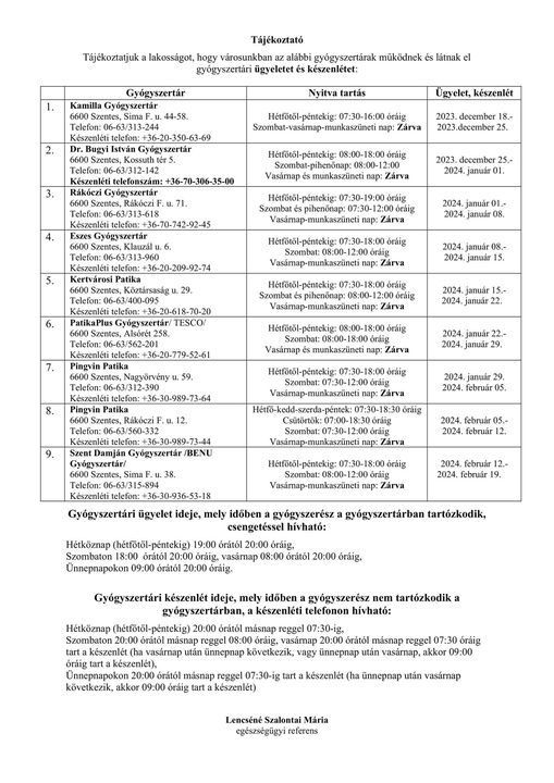 Gyógyszertári ügyelet és készenlét 2023. december 18. és 2024. február 19. között