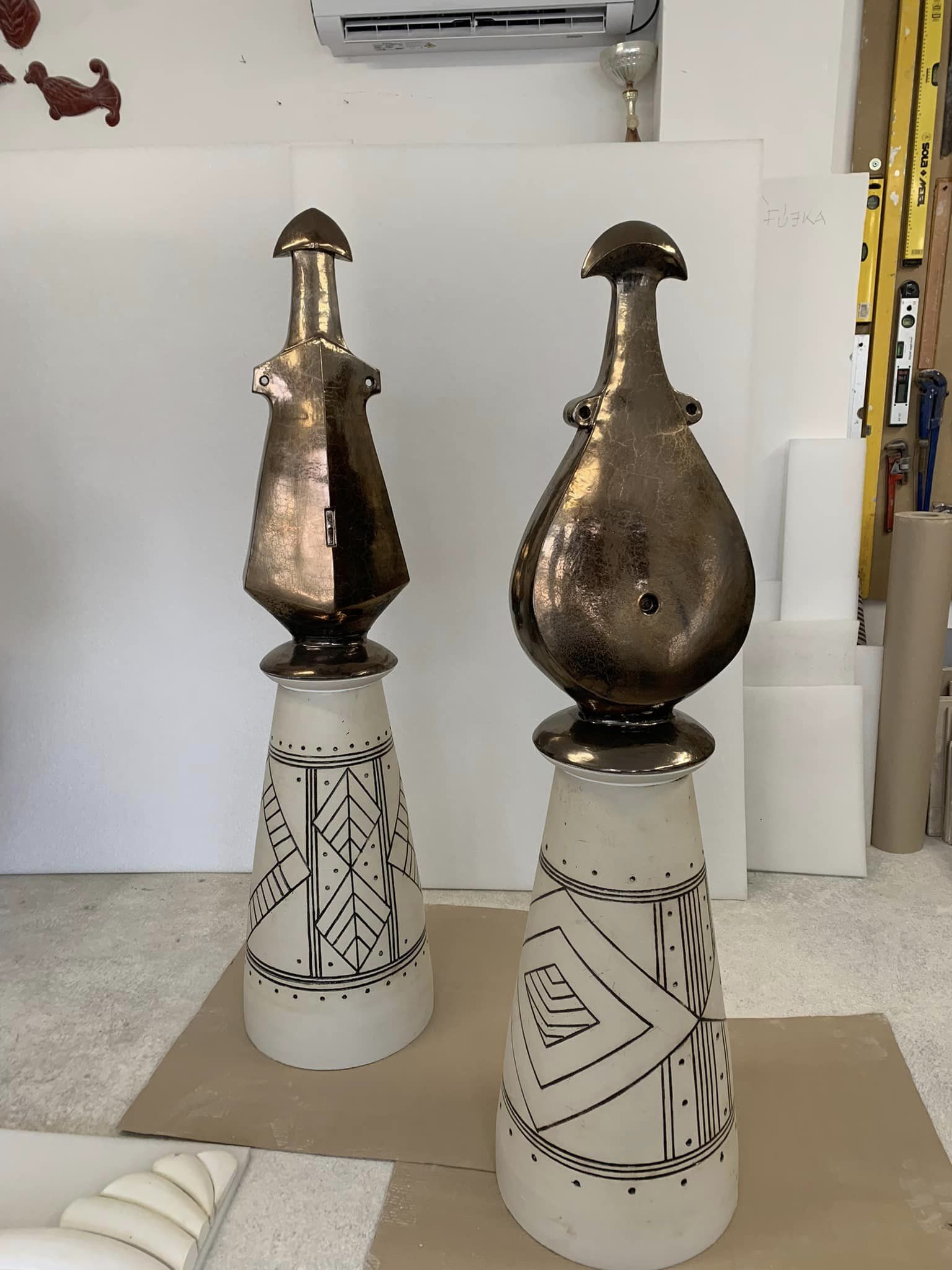iparművész és V. Nagy Nándor hódmezővásárhelyi restaurátor, képzőművész tervezett és készített a Kurca-parti sétányra. A kültéri elemek, sziklák mellett jelenik majd meg ez a női és férfi alakot ábrázoló plasztika.A Szentes környékén feltárt legrégebbi emlékek, ősmaradványok, a férfi és a női istenség megjelenítése volt az alapkoncepció, a kiindulási pont, mindez 21. századi megfogalmazásban. Az alkotások ipari porcelánból készültek, hangzott el a műhelylátogatáson.