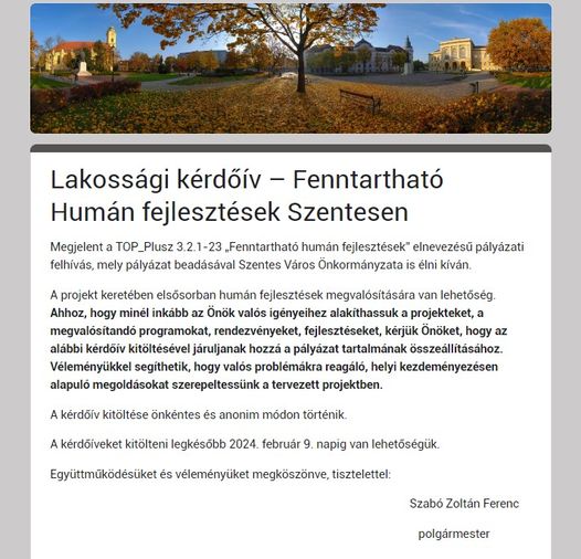 Tisztelt Lakosság! Megjelent a TOP_Plusz 3.2.1-23 „Fenntartható humán fejlesztések” elnevezésű pályázati felhívás, mely pályázat beadásával Szentes Város Önkormányzata is élni kíván.