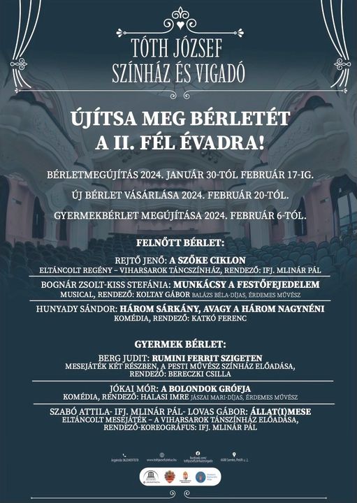 Újítsa meg színházbérletét a Tóth József Színház és Vigadóba február 17-ig Felnőtt bérlet ár 3 előadásra.