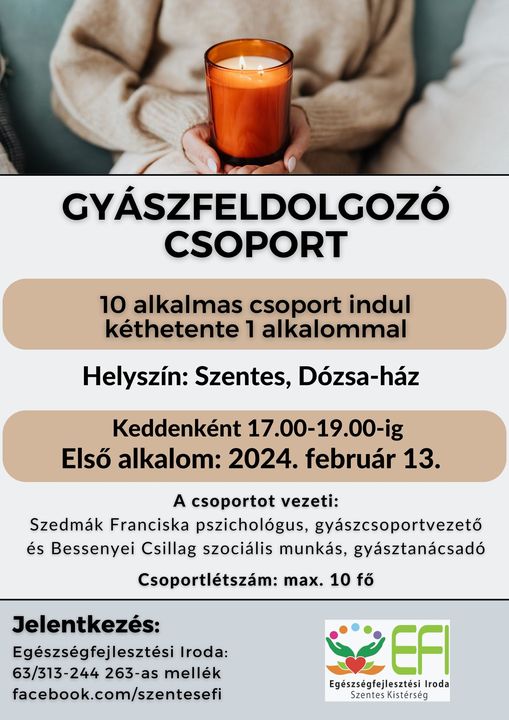 A Szentesi Egészségfejlesztési Iroda februártól 10 alkalmas gyászfeldolgozó csoportot indít. A részleteket a plakáton és lapunk 13. oldalán találják.