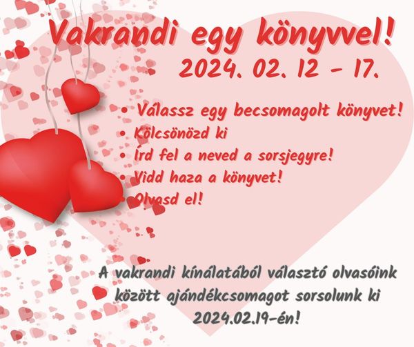 Nálunk február 12-17-ig tart a Valentin nap! Aki a becsomagolt könyvekből kölcsönöz, részt vesz egy sorsoláson – amennyiben a sorsjegyet kitöltve beteszi a kihelyezett dobozba. Sorsolás: február 19-én hétfőn