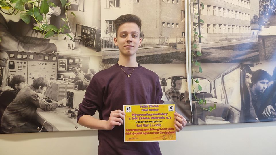 Iskolai témájú TikTok-videó pályázatot hirdettünk, és az első heti győztes Gundl Albert 9.A osztályos tanuló lett a közönségszavazatok alapján. Nyereménye egy komplett reggeli (Pollák-burger, kóla, nápolyi szelet) az iskolai büfében.