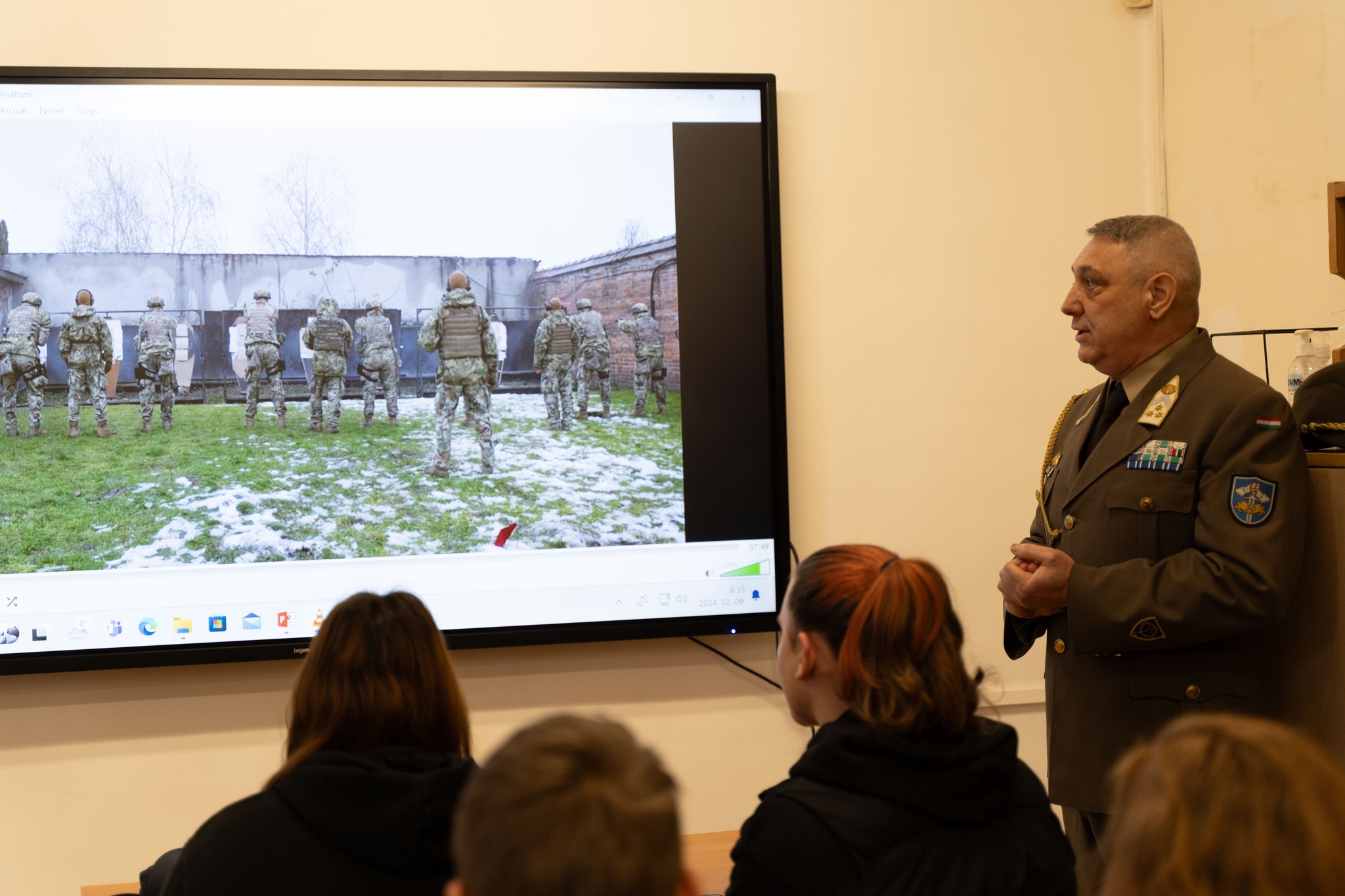 Három katonai szervezet, köztük az MH II. Rákóczi Ferenc 14. Műszaki Ezred tartott pályaválasztás előtt álló diákok számára tájékoztatót a szentesi Zsoldos Ferenc Technikumban.