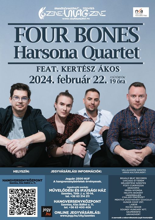 sikerrel Magyarországot, és Ázsiában is visszatérő vendégnek számítanak. Gyakran emlegetik őket „crossover” kvartettként, hiszen mindig is a műfaji határok szélesítésére, feszegetésére törekedtek, melyet számtalan előadás bizonyított az elmúlt két évtized során.Kezdőlap Kultúra és szórakozás Szentesi Művelődési Központ A Four Bones kvartett 2003-as megalakulása óta megfordult a világ számos országá…