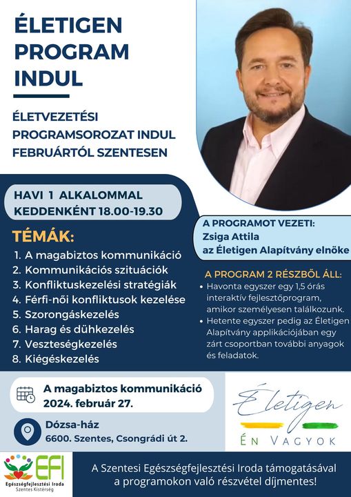 A Szentesi Egészségfejlesztési Iroda szervezésében februártól Életigen program címen életvezetési és mentálhigiénés programsorozat indul Szentesen. Az programsorozat első alkalmát február